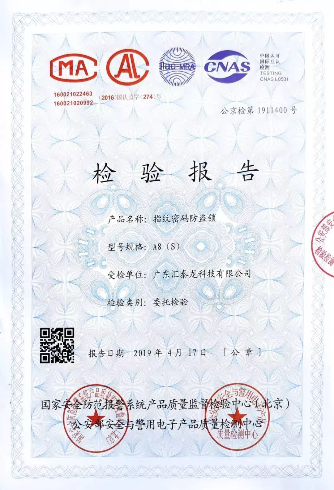 匯泰龍送檢的A8型指紋密碼防盜鎖,經國家安全防范報警系統產品質量監督檢驗中心(北京)公安部安全與警用電子產品質量檢測中心檢驗,通過強度、報警功能、高溫、低溫、振動、沖擊、自由跌落、抗靜電放電干擾、阻燃、防磁場技術(小黑盒)開啟、互開、防破壞能力等60余項與安全息息相關的檢驗。