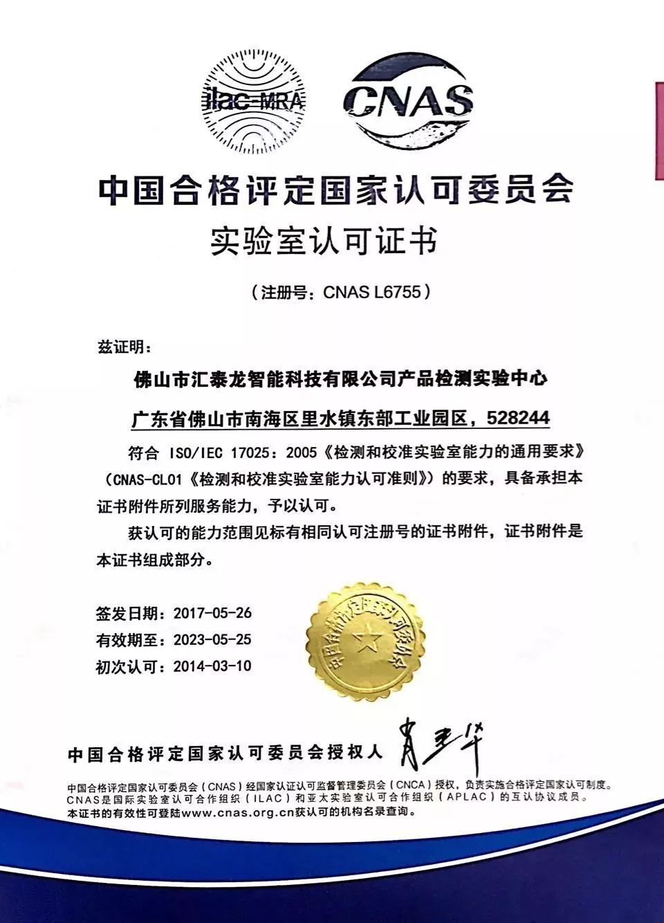 匯泰龍產品實驗檢測中心,于2014年通過CNAS認可,檢測能力覆蓋插芯門鎖、電子防盜鎖等產品,出具檢測報告“中國認可,國際互認”。