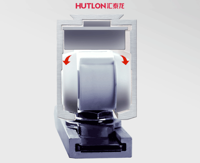 匯泰龍HE-1801緩沖吊輪的四個輪子均采用靜音斜面設計,灰塵可隨著移門被推動而從掉落,避免灰塵堆積。匯泰龍HE-1801緩沖吊輪自清潔,保證推拉順暢、靜音。