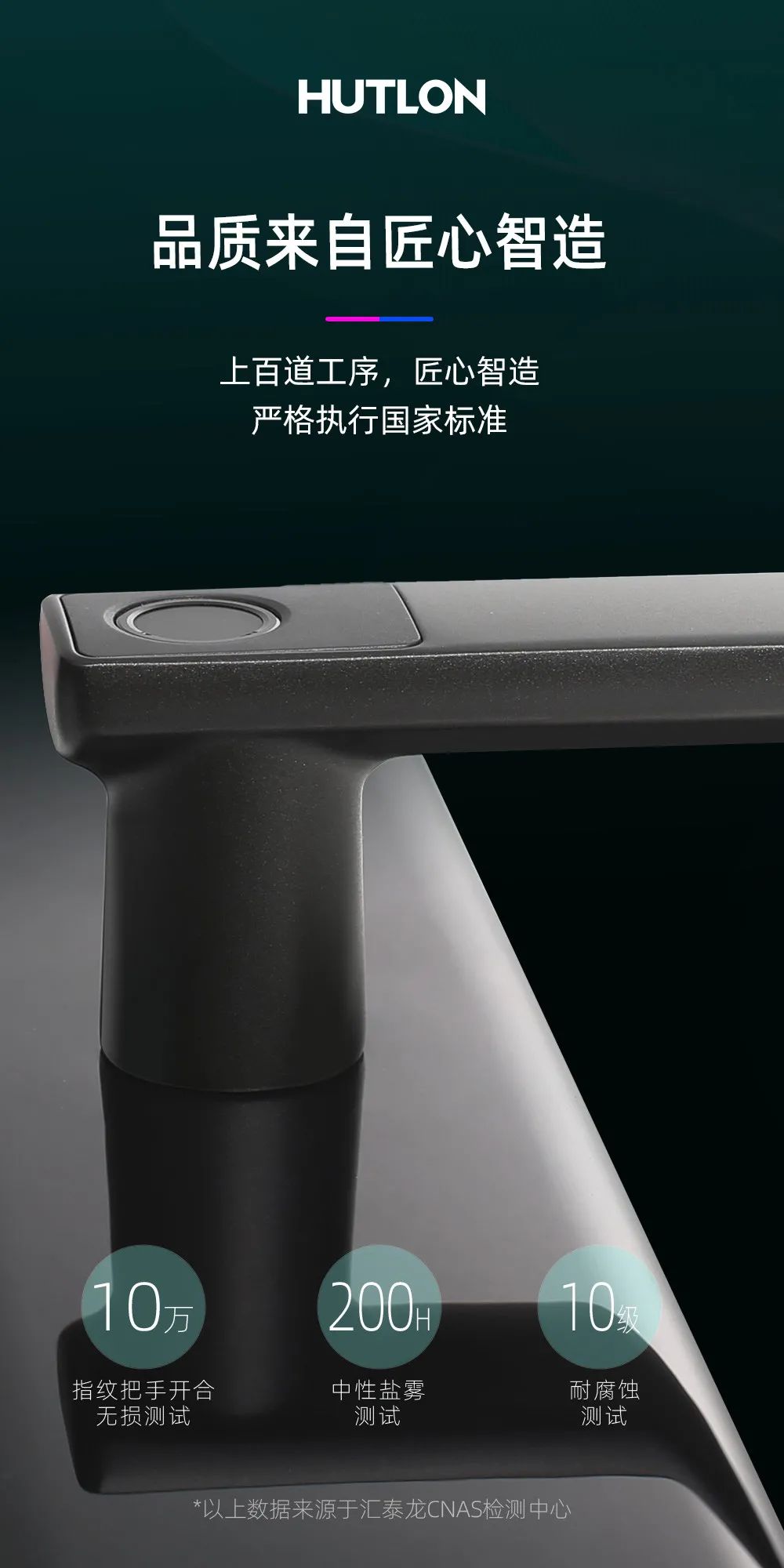 數十道檢測工序,匠心智造。匯泰龍A100智能鎖嚴格執行國家標準。經擁有國家CNAS實驗室認可的匯泰龍產品檢測中心檢測,匯泰龍A100智能鎖通過10萬次指紋把手開合無損測試,200小時中性鹽霧測試,10級耐腐蝕測試等數十道嚴格的質量檢測,產品品質穩定可靠。