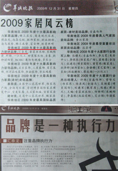 由羊城晚報《享周刊》《創意周刊》傾力主辦,羊城晚報報業集團旗下新快報、可樂生活、金羊網等多家媒體熱情協辦,廣東省裝修行業協會、廣東省家居商會等行業組織全力支持協辦的“華南地區2009年度最具影響力家居品牌”評選日前落下帷幕,評選結果在12月31日的《羊城晚報》上進行揭曉,共有華南區36家品牌企業獲獎,其中,匯泰龍憑借雄厚的品牌實力榮獲“華南地區2009年度十大最具影響力建材品牌”。