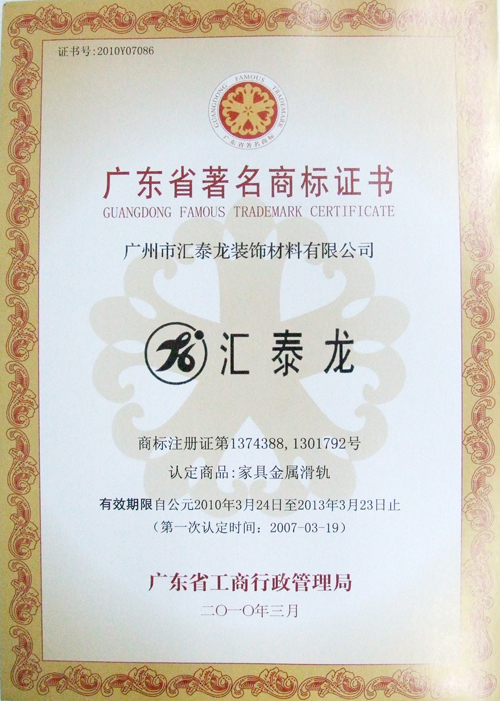 根據《廣東省著名商標認定和管理規定》和《廣東省工商行政管理局關于廣東省著名商標認定和管理的實施細則》的規定,經廣東著名商標評審委員會評審通過,繼2006年首次認定后,2010年3月,廣東省工商行政管理局再次認定“匯泰龍”商標為廣東省著名商標。