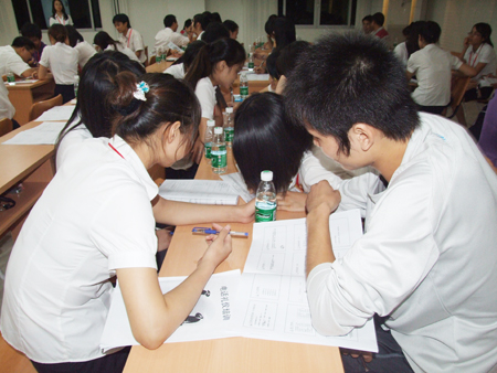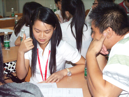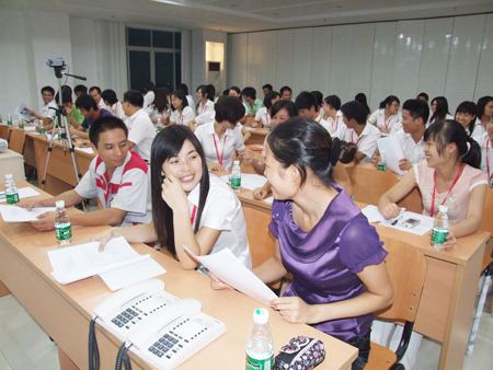 上半節的課程結束后,下半節課程主要由全體學員自由演練。學員們每四人分為一組分角色扮演,現場情景演練,同時對每一個情景邀請了臺下的小組上臺為大家表演,幽默的情景劇讓學習現場笑聲不斷,