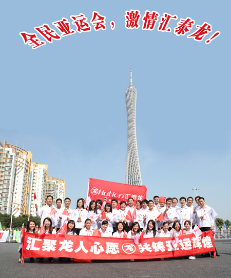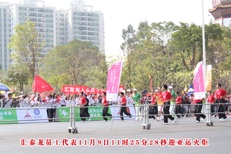 “亞運(yùn)加油!中國(guó)加油!匯泰龍加油!”,2010年11月9日11時(shí)25分28秒,當(dāng)?shù)?55棒火炬手經(jīng)過(guò)廣州著名標(biāo)志性建筑—廣州塔時(shí),藝洲路上的匯泰龍員工迎火炬代表方隊(duì)響起了潮水般的歡呼聲,氣氛熱烈。四十多名匯泰龍員工手舞國(guó)旗、公司旗,舉起寫(xiě)滿(mǎn)著匯泰龍員工簽名橫副,滿(mǎn)載著全體匯泰龍人對(duì)亞運(yùn)的祝福,在大道旁為火炬手歡呼鼓勁,為亞運(yùn)圣火傳遞助威!