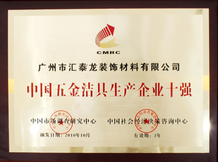 2010年11月,由中國市場調查研究中心和中國社會經濟決策咨詢中心聯合組織的“中國五金潔具生產十強企業、中國五金潔具生活十大暢銷品牌”的評比活動結果揭曉,匯泰龍公司榮膺“中國五金潔具生產企業十強”、“中國五金潔具生產十大暢銷品牌”的稱號,并獲得證書和獎牌。這是匯泰龍公司再一次榮獲全國性的獎項,標志著企業品牌進一步得到行業及消費者的充分認可。此次的評選結果將在《中國日報》和國家質檢總局主管、中國質檢報刊社主辦的中國品牌雜志社以及中國市場調查研究中心、中國社會經濟決策咨詢中心官方網站予以公布。