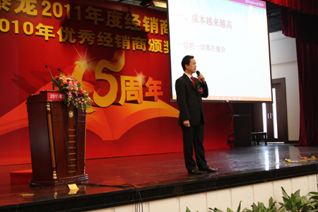 整個報告內容高瞻遠矚,陳董指出,在新形勢下,匯泰龍的大的發展方向不會動搖,但我們必須改變思維,知已知彼,順應市場發展趨勢,以不斷的創新來提高自身的核心品牌競爭力,他也在新形勢下也提出了總公司的近期規劃和對經銷商的期望,讓在座的經銷商進一步認清市場形勢、時刻具備市場競爭意識、不斷努力提高銷售業績,與總公司齊步向前、共同發展的重要性。陳董最后強調,2011年,匯泰龍的企業文化主題是“強化效率 快速發展”更深層次的涵義是:企業站在新的起點,必定會加快發展步伐,希望眾多經銷商跟上總公司的發展腳步,齊頭并進,攜手向前。