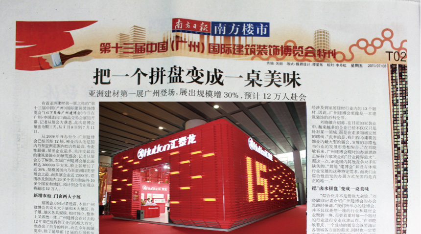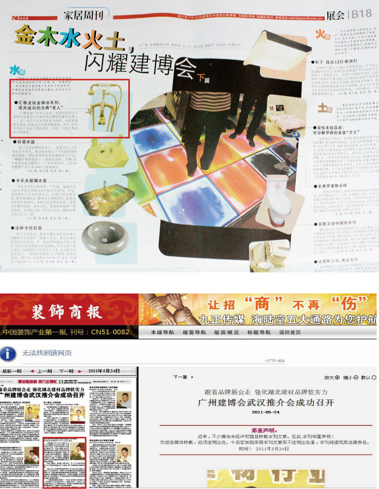 《裝飾商報》摘自陳董在建博會武漢推介會上的講話:作為廣州建博會一名忠誠的合作伙伴,作為一個全國知名的五金衛浴品牌,匯泰龍一直努力打造匯泰龍夯實的企業文化與品牌文化?!蒙碛谶@劇烈的國際性市場當中,已有十五年歷史的匯泰龍五金衛浴深知,有品牌才有世界地位!……