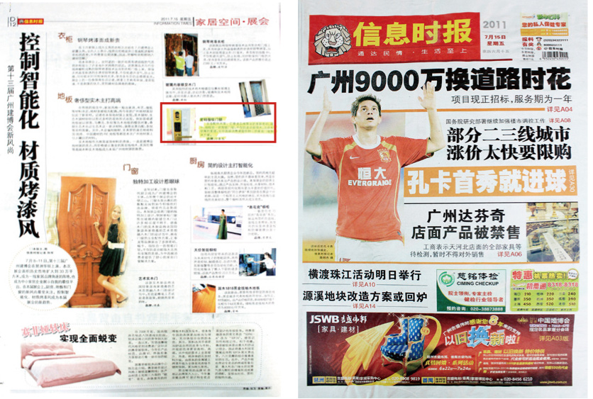 《信息時報》匯泰龍新款電子鎖:……五金配件方面,匯泰龍品牌展出的多款密碼、磁卡、指紋合一的智能門鎖,不僅防盜功能強大,且具有金屬的美感,為中高端消費者提供舒心的家居門窗解決方案……