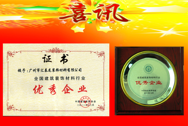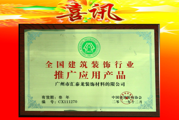 經過嚴格的審查、審核、審批程序,在本次會議上,中國裝飾材料協會正式頒發匯泰龍裝飾材料有限公司《全國建筑裝飾行業推廣應用產品證書》。