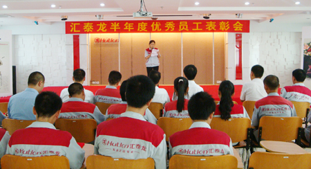 7月20日,匯泰龍佛山南海生產基地辦公樓五樓會議廳聲樂交響、燈火通明,匯泰龍2012年度第二季度優秀員工(七級員工)表彰大會隆重召開。公司人事行政中心總監任志平先生、制造中心生產管理部經理張祖林先生、各車間主任及優秀員工到會,會議上任總監首先發表了講話,他在演講中提到,一個優秀的企業離不開每一個優秀的團隊,優秀的團隊的品質必須由每一位優秀品質的員工才能體現,受表彰的幾位優秀員工在平凡的崗位上兢兢業業,足以成為匯泰龍人學習的榜樣,接著他宣讀了《2012年度第二季度優秀員工名單》,公司領導對這些經民主投票評選出的優秀員工進行頒發榮譽證書并進行表彰,獲獎員工覃云清、李登芳代表全體優秀員工發言,最后,所有嘉賓與優秀員工合影留念。表彰大會氣氛熱烈,在圓滿完成會議議程之后,表彰大會隆重閉幕。