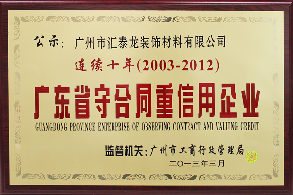 匯泰龍公司自成立以來,嚴格遵守《中華人民共和國合同法》和公司關于合同管理的相關規定、強化合同管理機制、加強公司合同信用建設。經過十七年的發展,匯泰龍人深刻理解“人無信不立,企無信不興”這一信條,并以“品質造就滿意”作為經營理念深深的把“誠信”植根于每一個匯泰龍人的心中,把“誠信”貫徹到日常工作的方方面面?!皬V東省守合同重信用企業”榮譽稱號是誠信企業的金字招牌,是對企業信用的最權威評定。誠信是企業發展的興業之本,更是企業塑造品牌的立足之本。匯泰龍把“守合同重信用”作為打造成社會誠信的標榜,積極做好誠信體系建設,為打造“誠信廣州”和促進中國裝飾材料行業市場又好又快發展做出新的更大的貢獻。