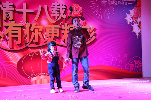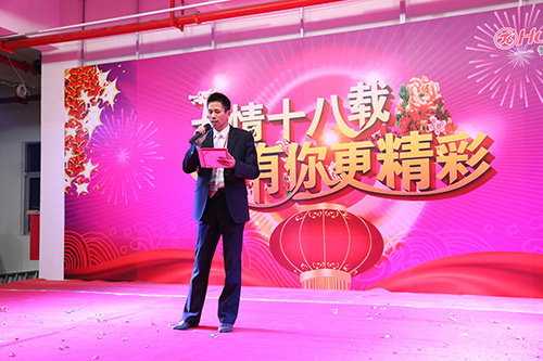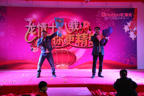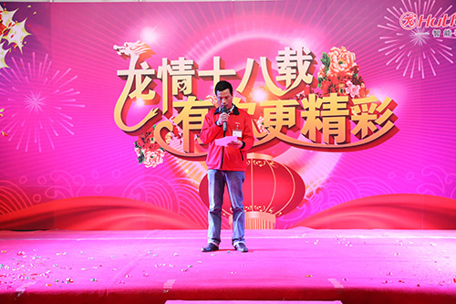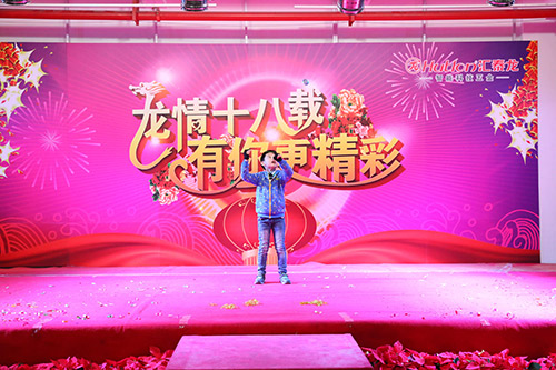 在四位主持人的引導下,陳董上臺發表新年賀辭,他首先向大家總結了我們在2014年取得的成績,對一年來全體匯泰龍人的付出和努力表示感謝,同時,他指出2014年受房地產行業的影響,整個家居建材行業都很嚴峻,我們匯泰龍公司全體同仁齊心協心仍然取得了一定的成績。面對2015年,我們通過轉型、一系列變革等措施,一定會繼續發力,再創匯泰龍的輝煌。最后,他熱情洋溢地表達了對在場所有員工和員工家人新年的祝福,在場的員工深受鼓舞,報以雷鳴般的掌聲。