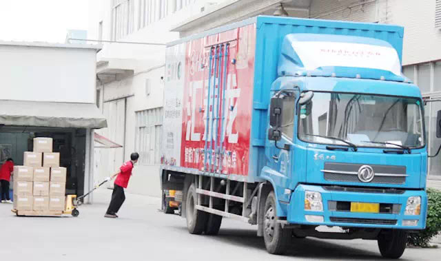 幾輛發貨車整齊停在車間門口,正在等待裝貨