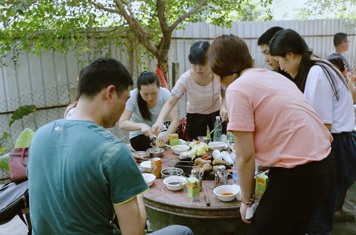 經歷過CS野戰后,我們一行人已經餓得前胸貼后背了。下山后,大家稍作休整,開始野營燒烤,滾紅的炭火燒起來,各種肉類在燒烤網上冒出熱氣和濃濃的肉香,不一會兒,大家便開始大快朵頤的將食材一掃而空。