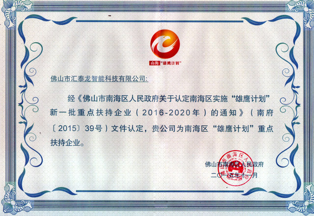 佛山市匯泰龍智能科技有限公司被認定為南海區“雄鷹計劃”重點扶持企業
