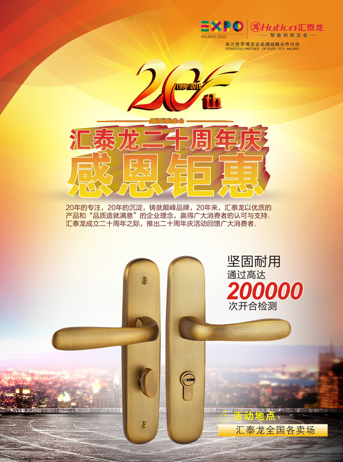 20年的專注,20年的沉淀,鑄就巔峰品牌,20年來,匯泰龍以優(yōu)質(zhì)的產(chǎn)品和“品質(zhì)造就滿意”的企業(yè)理念,贏得廣大消費者的認可與支持。匯泰龍成立二十周年之際,推出二十周年慶活動回饋廣大消費者。