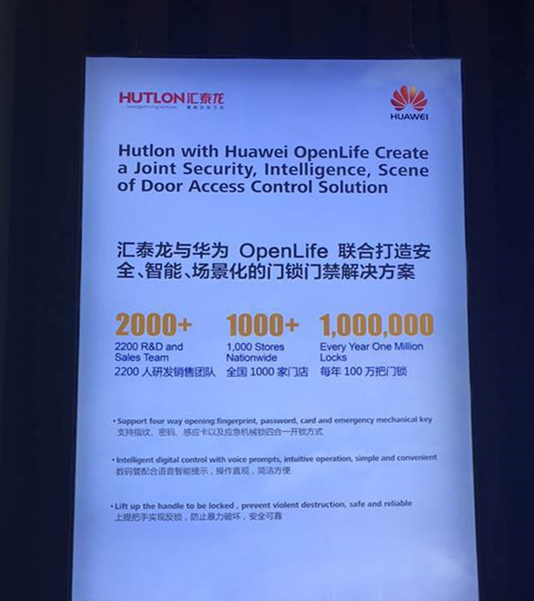 2016年9月2日,華為歷史上規模最大的面向ICT行業的全球生態大會——HUAWEI CONNECT 2016 在上海世博中心落下帷幕。匯泰龍作為華為OpenLife智慧家庭重要戰略合作伙伴之一應邀亮相上海世博中心,面向全球120多個國家和地區的20000名業界精英,展示基于華為OpenLife智慧家庭生態的匯泰龍門鎖門禁解決方案,并憑此獲得華為開發者生態最佳解決方案獎。