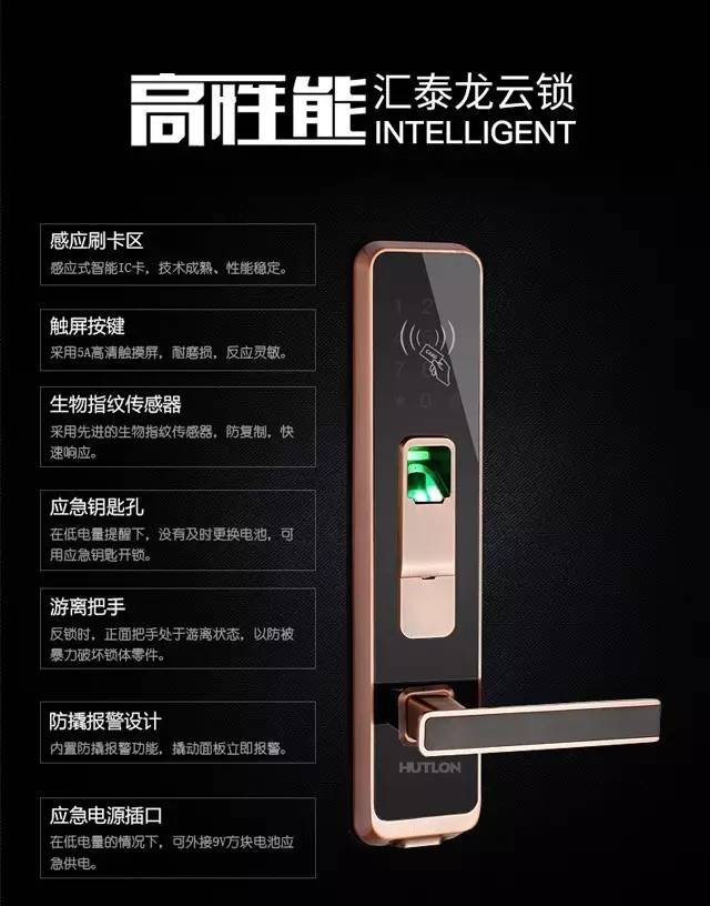 匯泰龍云鎖采用先進的生物識別技術,擁有指紋、密碼、感應卡、機械鑰匙、手機APP五合一開鎖方式,指紋輕觸間實現開鎖,配有真人語音提示,且擁有低電量雙重提醒功能。擁有十幾項發明專利,幾十項實用新型專利,集便捷、安全于一身。