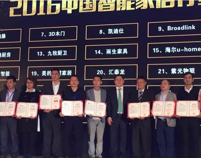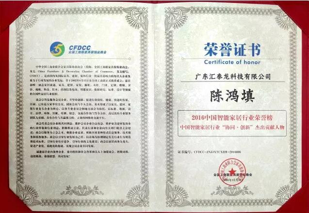 在接下來的2016中國家居業優秀品牌表彰大會上,匯泰龍公司榮獲中國智能家居行業“協同·創新”貢獻大獎、中國智能家居行業產品設計大獎;陳鴻填先生榮獲中國智能家居行業“協同·創新”杰出貢獻人物榮譽!