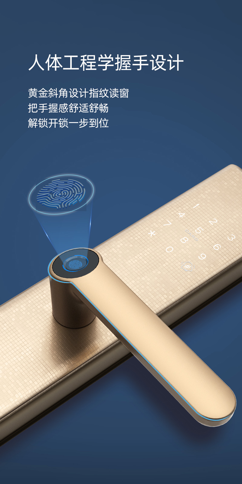 .半導(dǎo)體指紋頭設(shè)計在把手上,識別率高,識別速度快,指紋識別和下壓把手一步開門
