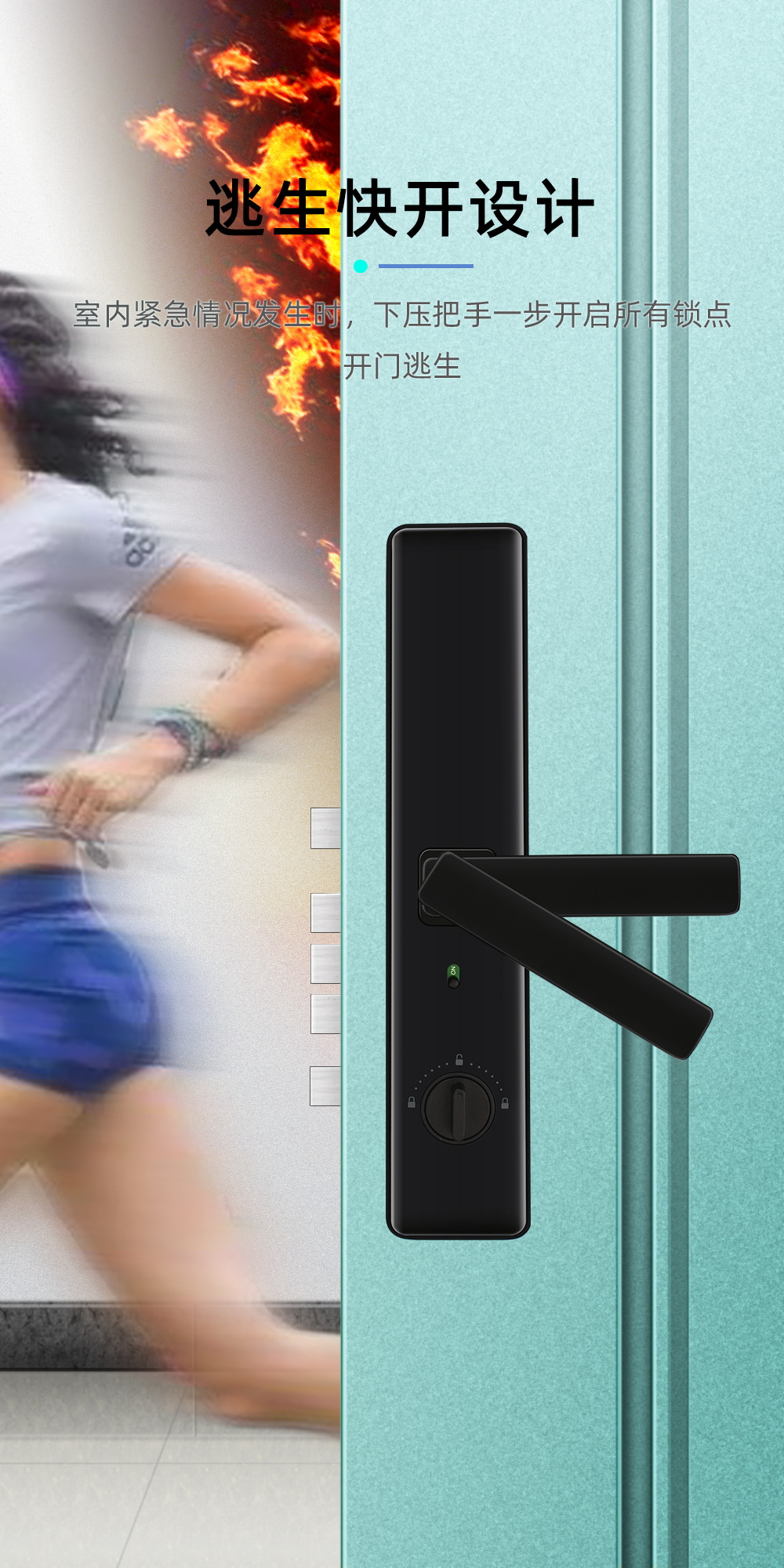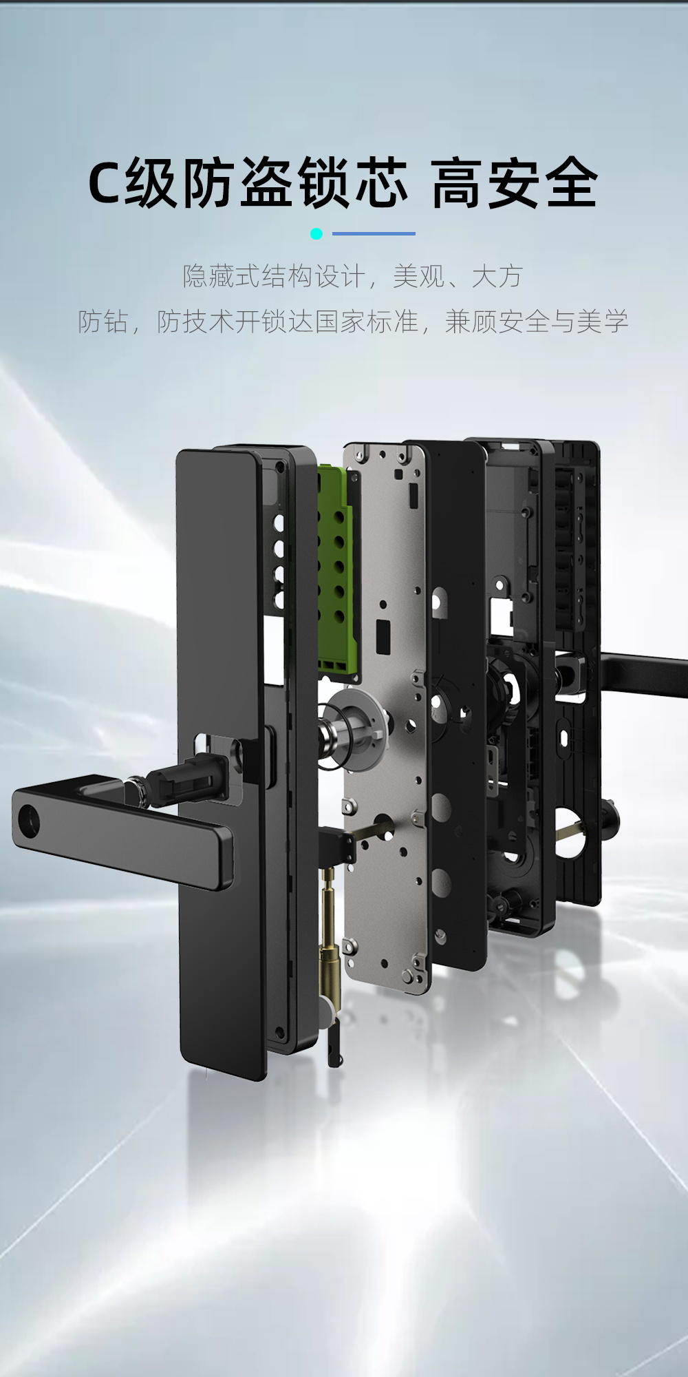 支持指紋、密碼、感應(yīng)卡、機(jī)械鑰匙四合一開鎖方式;