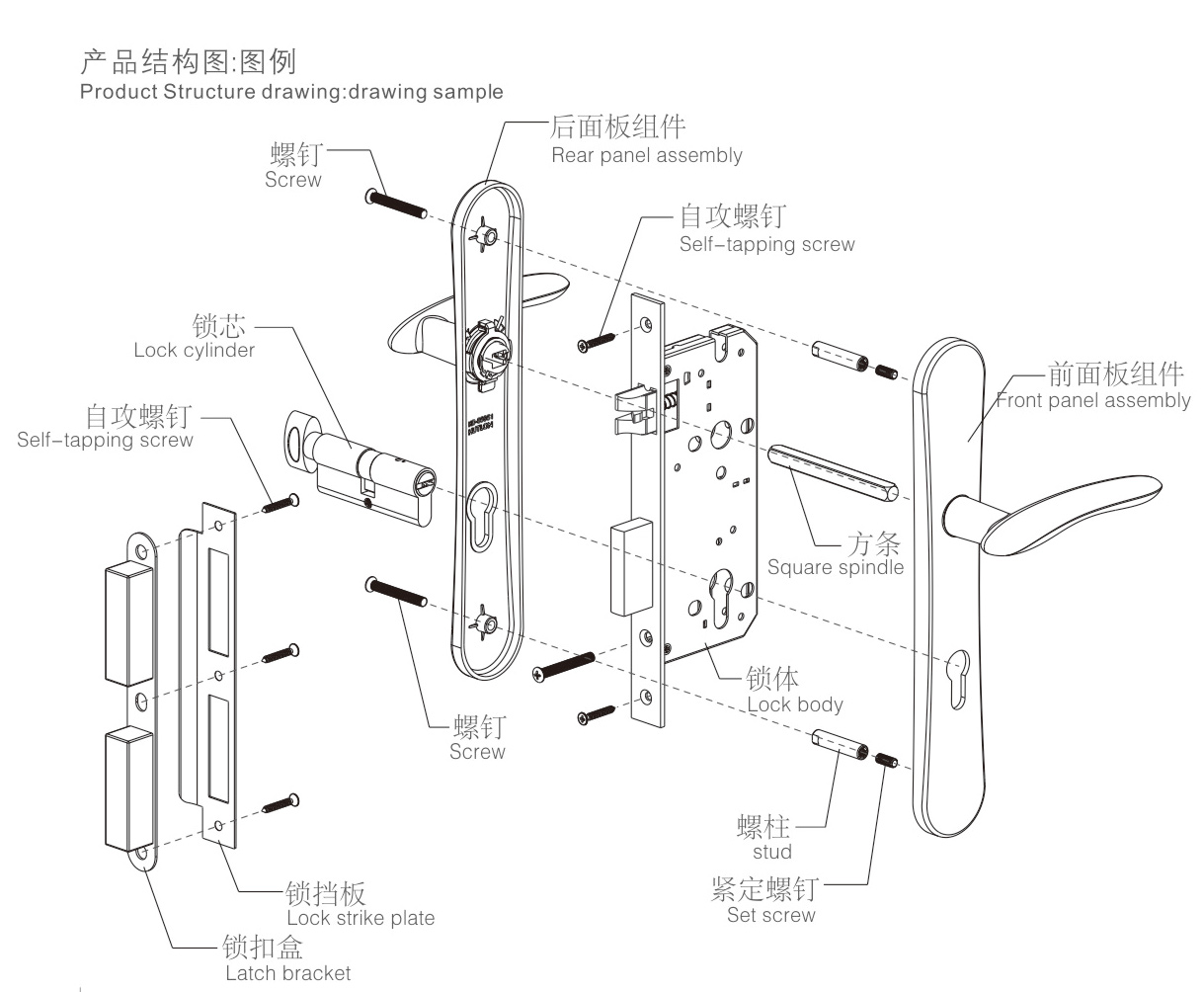 6擰緊螺釘,安裝扣板及扣盒,對齊鎖體,應使鎖舌與之配合順暢,擰緊螺釘(如上圖:H)。