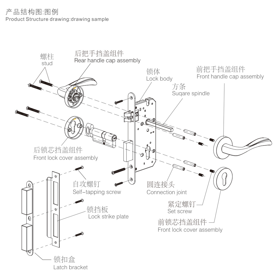 6擰緊螺釘,安裝扣板及扣盒,對齊鎖體,應使鎖舌與之配合順暢,擰緊螺釘(如上圖:H)。