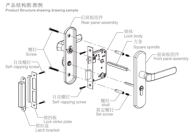 6擰緊螺釘,安裝扣板及扣盒,對齊鎖體,應使鎖舌與之配合順暢,擰緊螺釘(如上圖:H)。