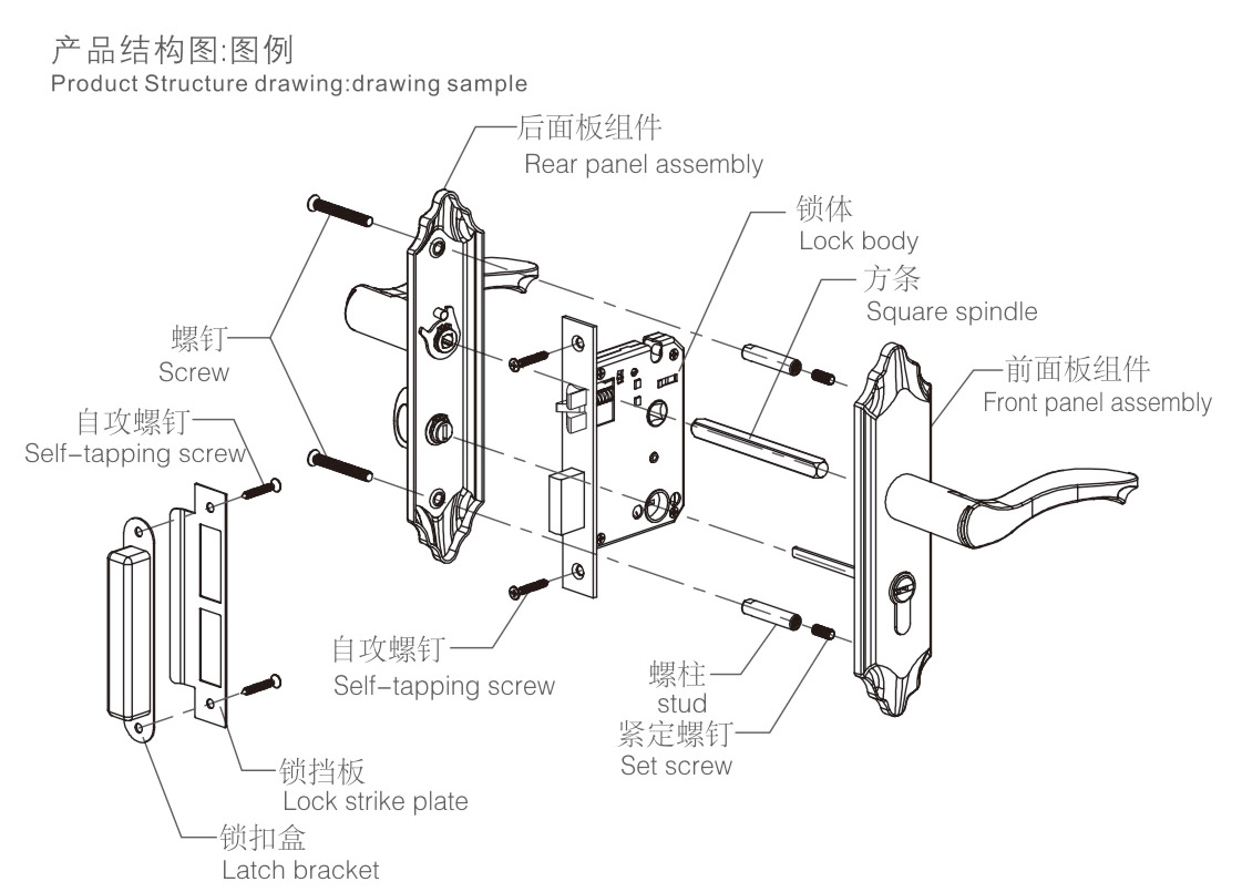 6擰緊螺釘,安裝扣板及扣盒,對齊鎖體,應使鎖舌與之配合順暢,擰緊螺釘(如上圖:H)。