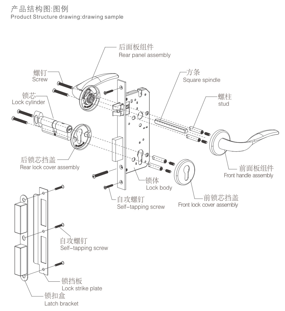 4、使鑰匙及旋鈕轉動順暢,擰緊螺釘,安裝扣板及扣盒,對齊鎖體,應使鎖舌與之配合順暢,擰緊螺釘(如下圖:H)。